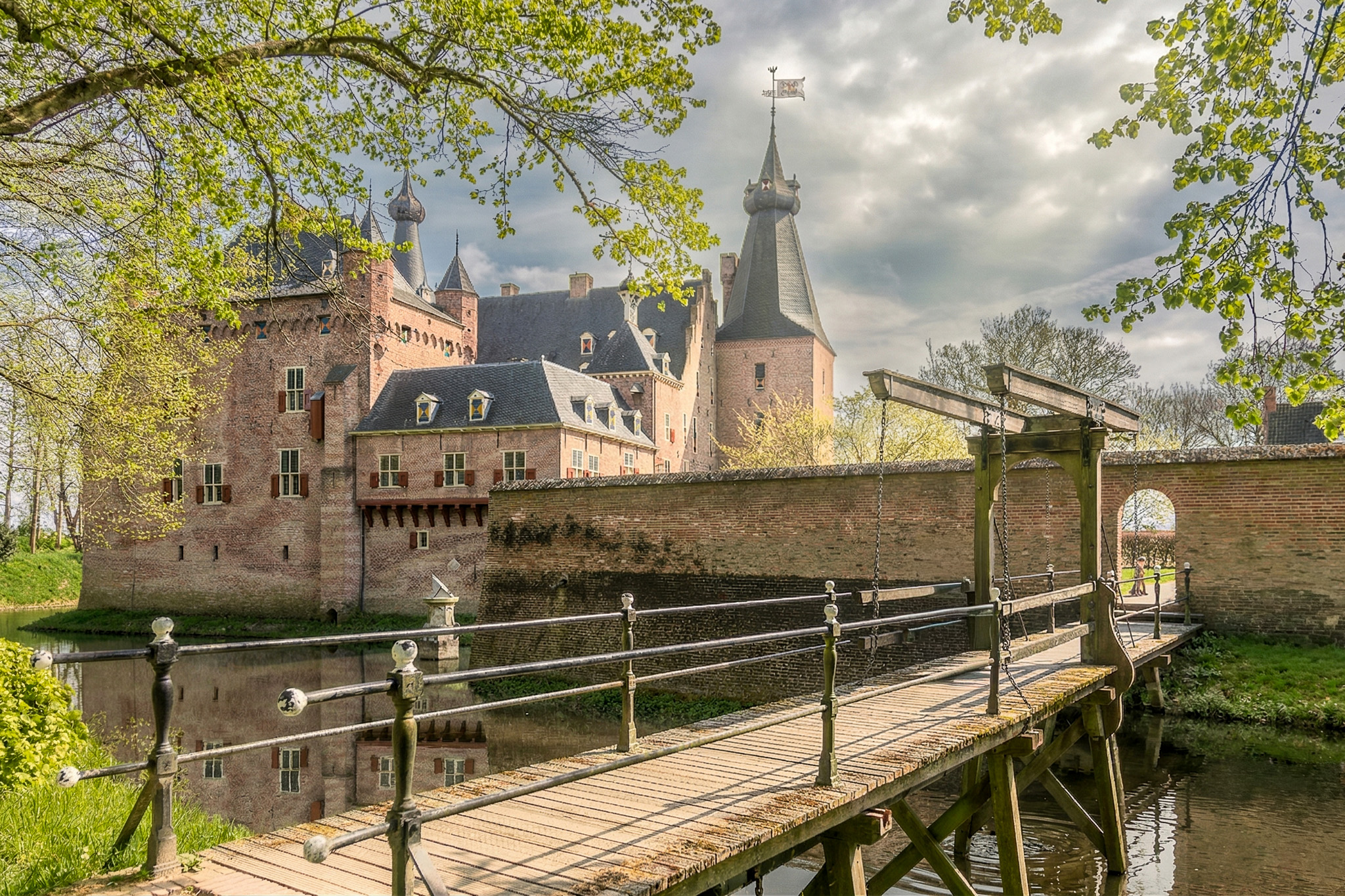 De klassieke aanblik met de ophaalbrug maakt het kasteel meteen herkenbaar, maar juist die brug geeft fotografisch ontzettend veel mogelijkheden. Het is een natuurlijke leidende lijn die je als fotograaf bijna automatisch het beeld in trekt. In jouw foto werkt dat perfect: de brug begint onderin het beeld en voert de kijker rechtstreeks naar het kasteel.